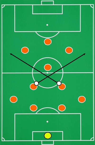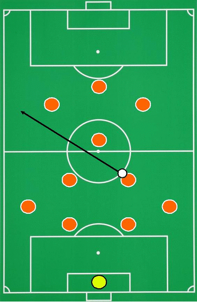 When these long diagonal passes are made, it occurs to me that they can be broken down into two basic categories, which affect how the passage of play develops. I would label these as contested and uncontested diagonals. Let me explain this in diagram form.