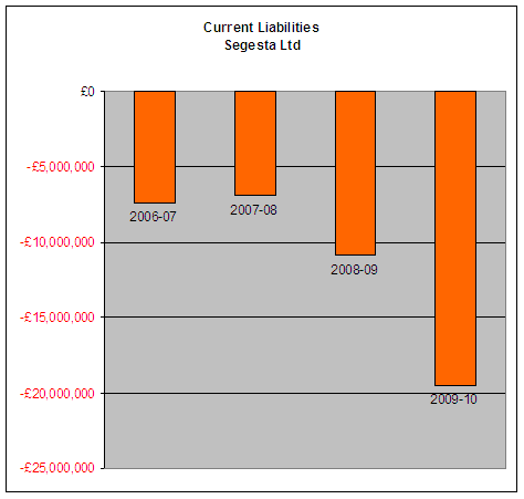 The group’s total debt has obviously sharply increased from 2008/09 (£15.4m) to 2009/10 (£27.2m), but in order to understand this it is necessary to drill down into the debt in more detail. Creditors are separated into two categories in the accounts – debts due within one year (current liabilities) and debts due after more than one year (long-term liabilities). First we’ll analyse the current liabilities – these are shown below.