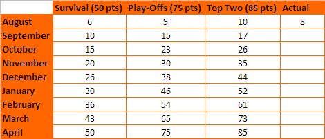 | Points targets for three end-of-season scenarios, weighted by difficulty of fixtures. ‘Pool on course for upper mid-table finish. |