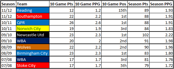 The table below, starting with the most recent season (11/12), shows how many points each of the promoted teams had accumulated after 10 matches, how many points per game and their league position at that stage. It also shows their final points tally and overall points per game at the end of the season. The chart produces some notable statistics…