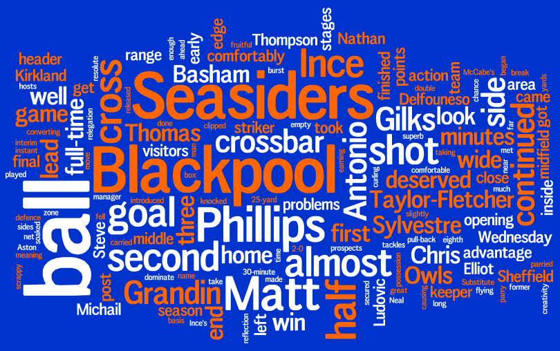 For those who are unfamiliar with how this works, the following is a word cloud based on match reports from the BBC and Blackpool’s official website, displaying words in different sizes according to their frequency. The word cloud has been created using wordle.net.
