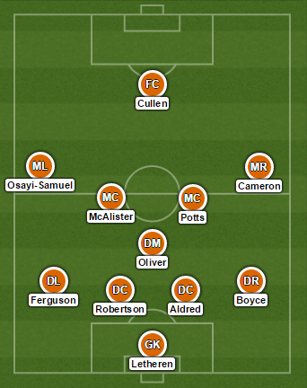 Connor Oliver was brought into the side and given the responsibility of sitting in front of the back four, while the only other change from the 2-1 defeat to Burton Albion in midweek was Tom Aldred who replaced Lloyd Jones. The change of shape meant that Mark Cullen was handed the uneviable task of ploughing a lone furrow in attack.