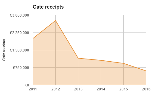 It’s not just season tickets which are falling of course. Gate receipts, comprised of individual home tickets, cup games and away fans has also been steadily falling in the last six seasons.