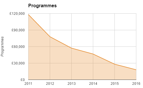 The heady days of being sponsored by everyone’s favourite payday loans company Wonga seem like a long time ago as sponsorship dropped by over 50% following relegation from the Championship. Well, surely people were still buying programmes at least?