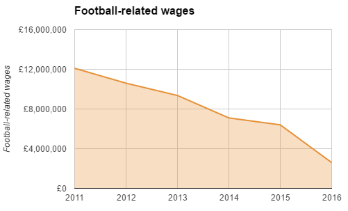 When you examine the “Key Performance Indicators” section of the accounts, the following sentences are particularly glaring: “The directors (sic) view is that the funds generated by the Club (sic) should be carefully used within defined budgets and strategic plans to protect the future of the Club (sic). Spend on Players (sic) and Managers (sic) wages in the financial year being reported was £2.6m (2015: £6.4m)”. This represents a massive 60% cut to the playing budget following relegation to League One and a continuing decrease in the wage bill since the Premier League.